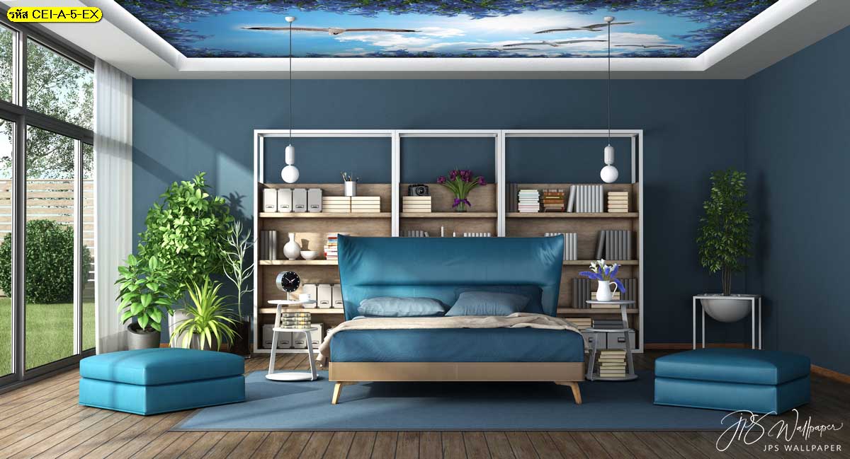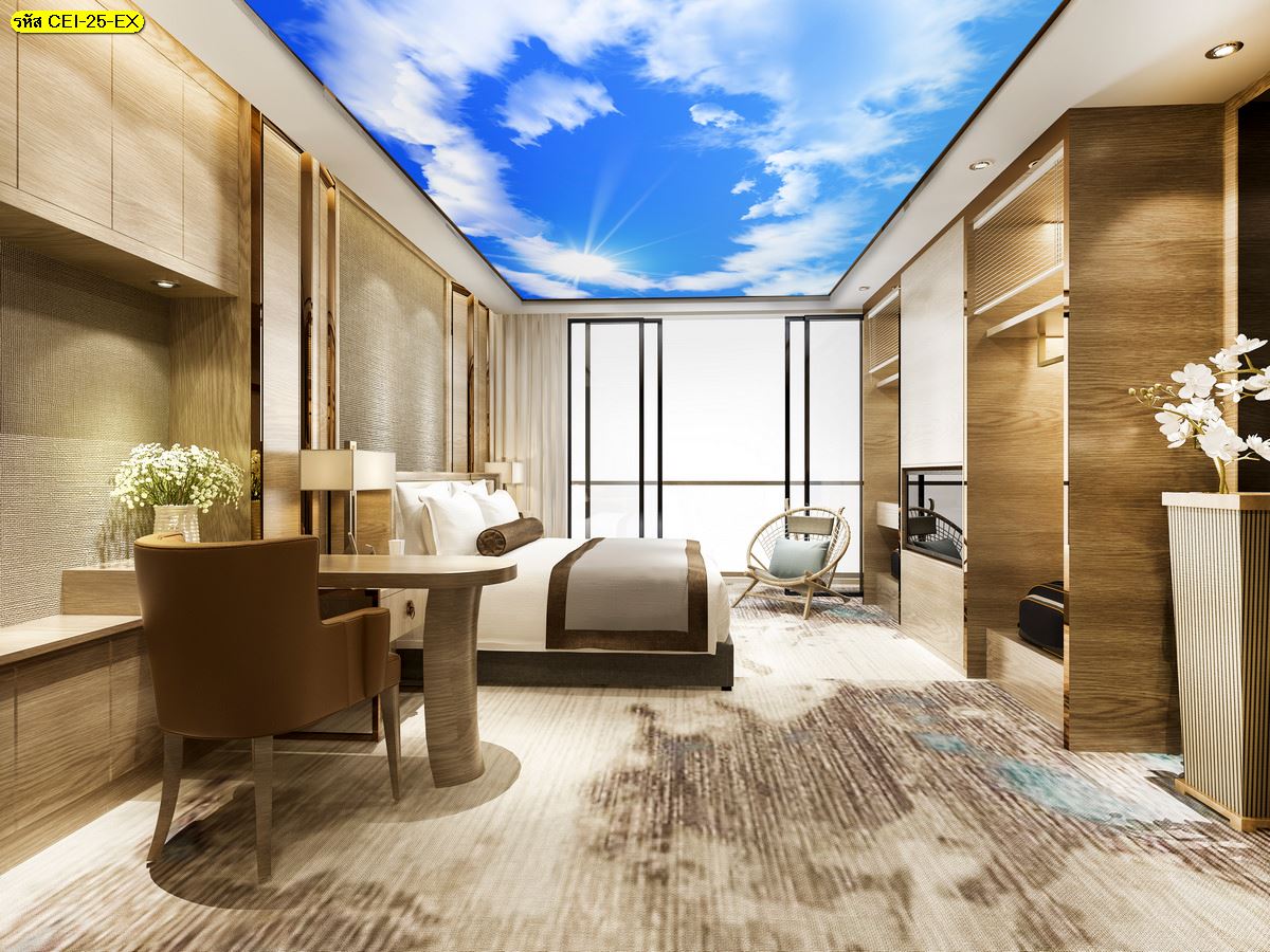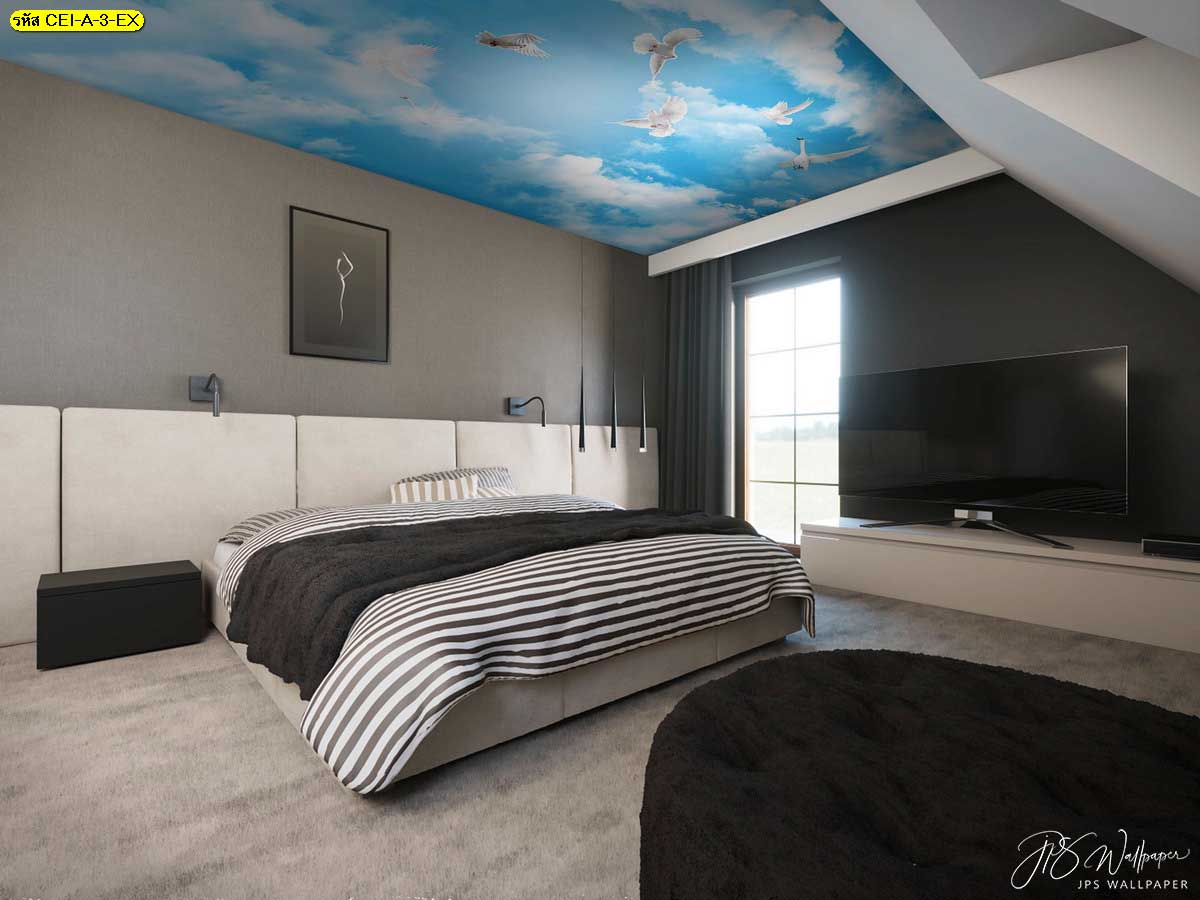 ห้องนอนเหมาะใช้วอลเปเปอร์เพดานลายท้องฟ้าสีฟ้าใสในการตกแต่ง ซึ่งจะช่วยให้ห้องนอนรู้สึกสงบ เหมาะแก่การนอนพักผ่อน
