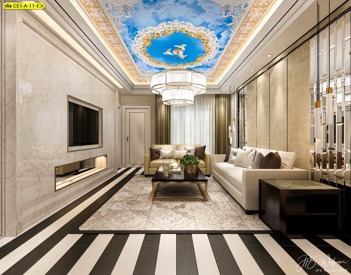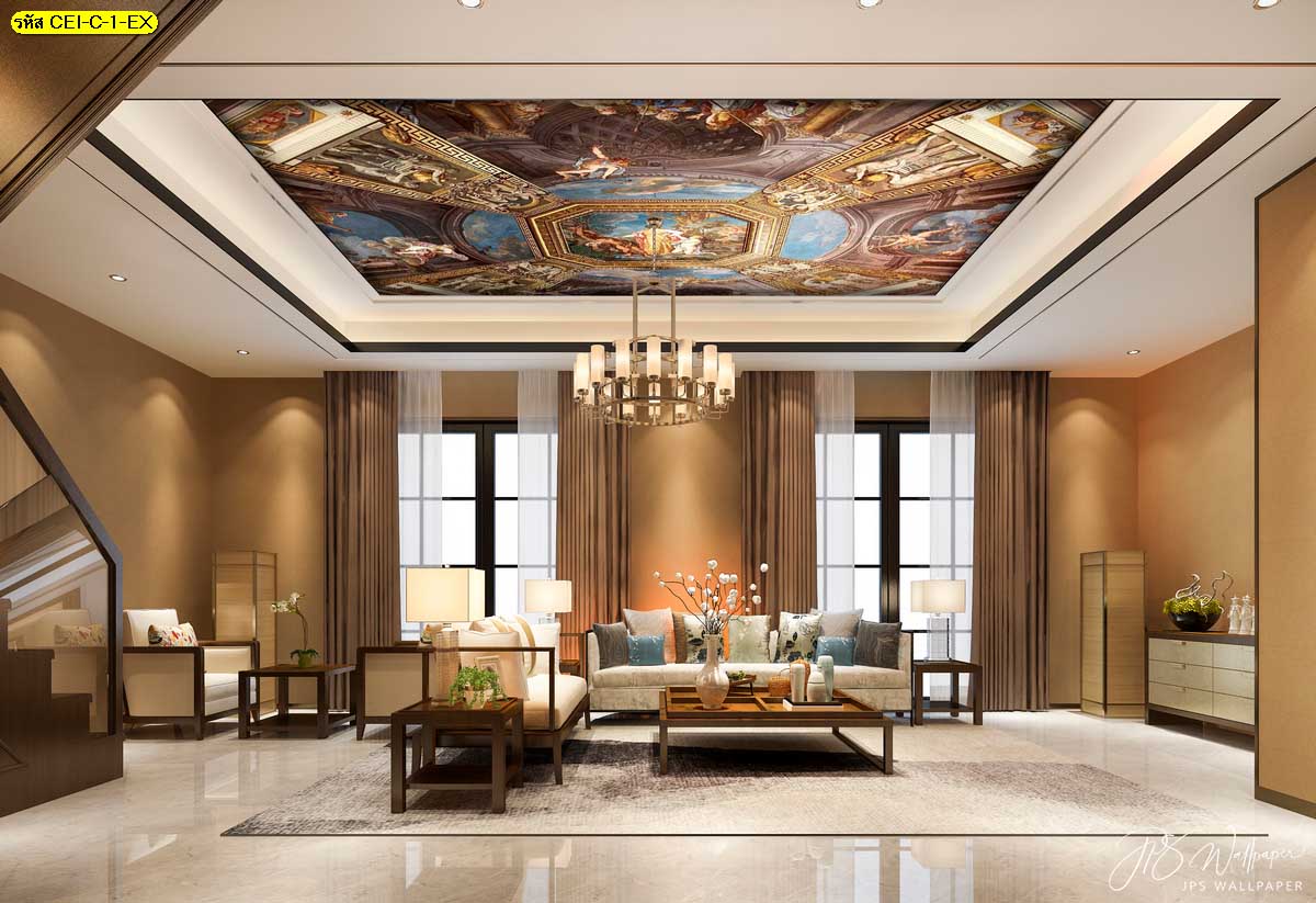 พื้นที่เพดานใหญ่ ๆ เช่น โถงกลางบ้าน ควรเลือกใช้วอลเปเปอร์เพดานลายศิลปะแนววิมาน ซึ่งจะช่วยยกระดับความพรีเมียม สร้างภาพลักษณ์ของบ้านให้หรูหราสะดุดตา