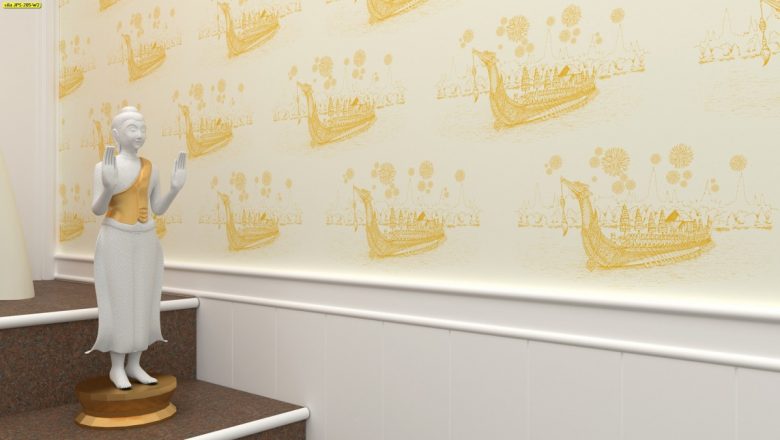 แต่งบ้านให้น่าหลงไหลและมีเสน่ห์ได้ง่ายๆด้วยวอลเปเปอร์ลายเรือสุพรรณหงส์ สีทองพื้นขาว เหมาะสำหรับตกแต่งบ้าน ตกแต่งห้องพระ ติดตั้งในพระอุโบสถ ศาลา ไอเดียตกแต่งห้องพระ เป็นสินค้าสำเร็จรูป