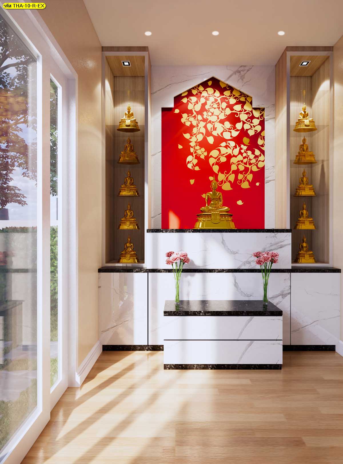 เหมาะสำหรับพื้นที่กระจกในศาลา ห้องปฏิบัติธรรม โถงทางเดิน หรือจุดที่ต้องการความสงบและงดงามตามแบบไทย